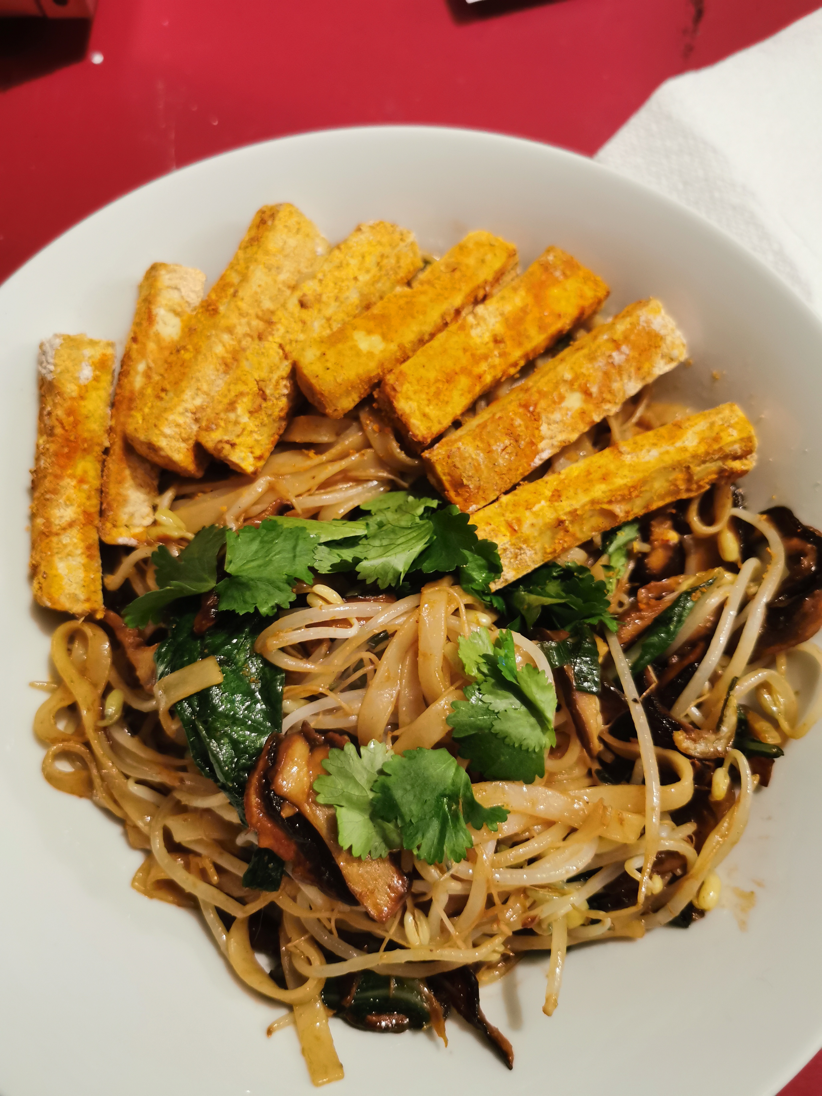 Quand la cuisson convient, ajouter les pousses de haricot mungo, les feuilles de persil, de coriandre ainsi que le vert d'oignon et finir brièvement la cuisson (vous pouvez aussi tout garder cru, si vous aimez). Faire subir le même sort aux nouilles et terminer par un filet d'huile de sésame.